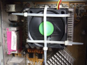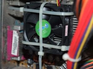 Server down可以有好多原因,但這一次真係估佢唔到:CPU fan打柴而配不到同款新扇,因為坊間買到的新扇扇身比壞了的那把厚得多,以致原有的那些鏍絲全不夠長,無法把新扇穩定在CPU散熱片上,而五金舖在週末又不開門做生意,配不到鏍絲,最後惟有聽電腦店的哥仔教路用索帶試試: